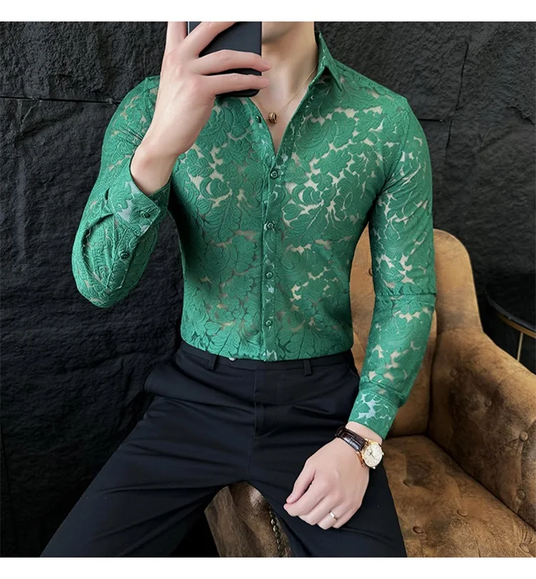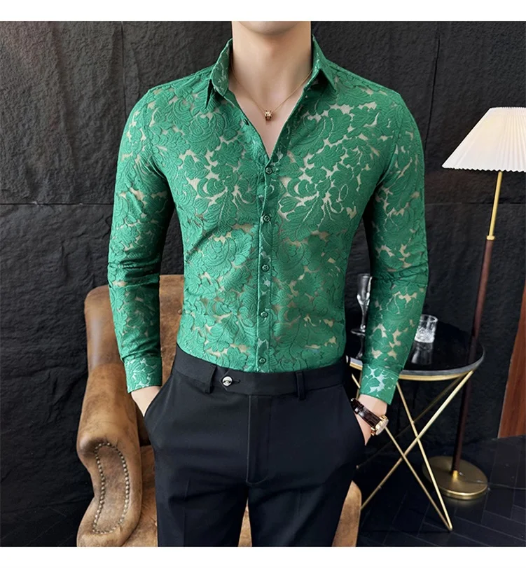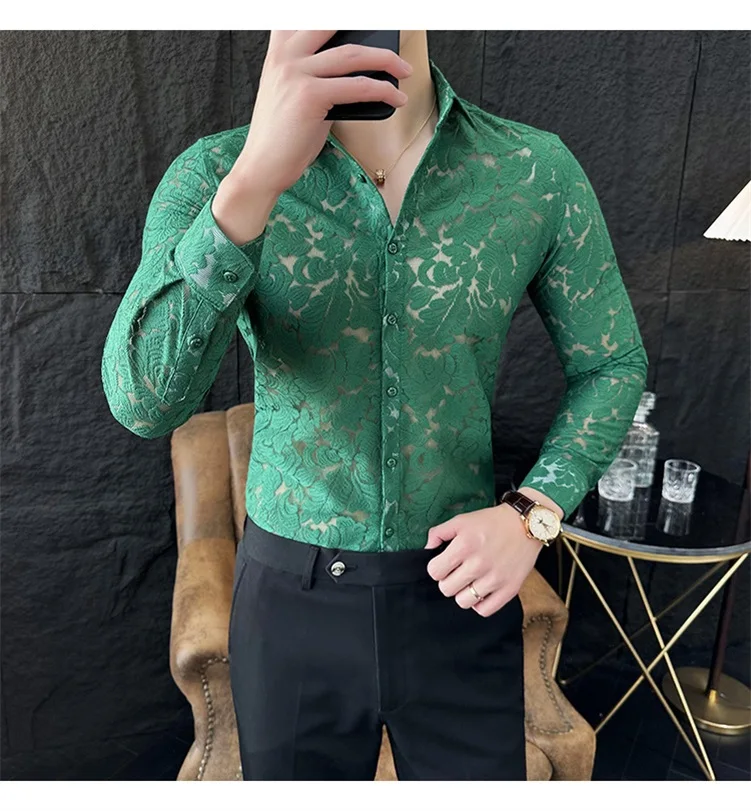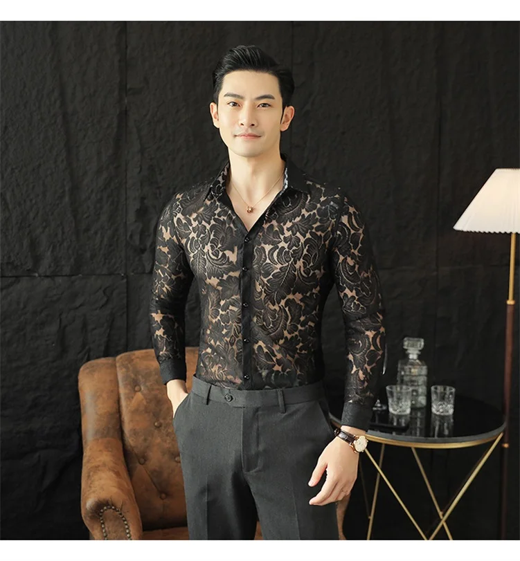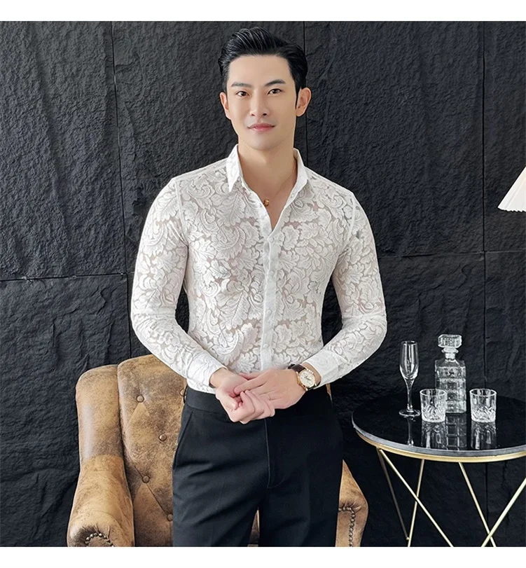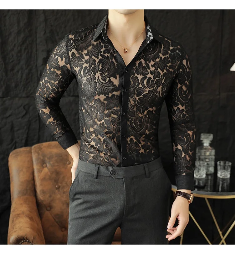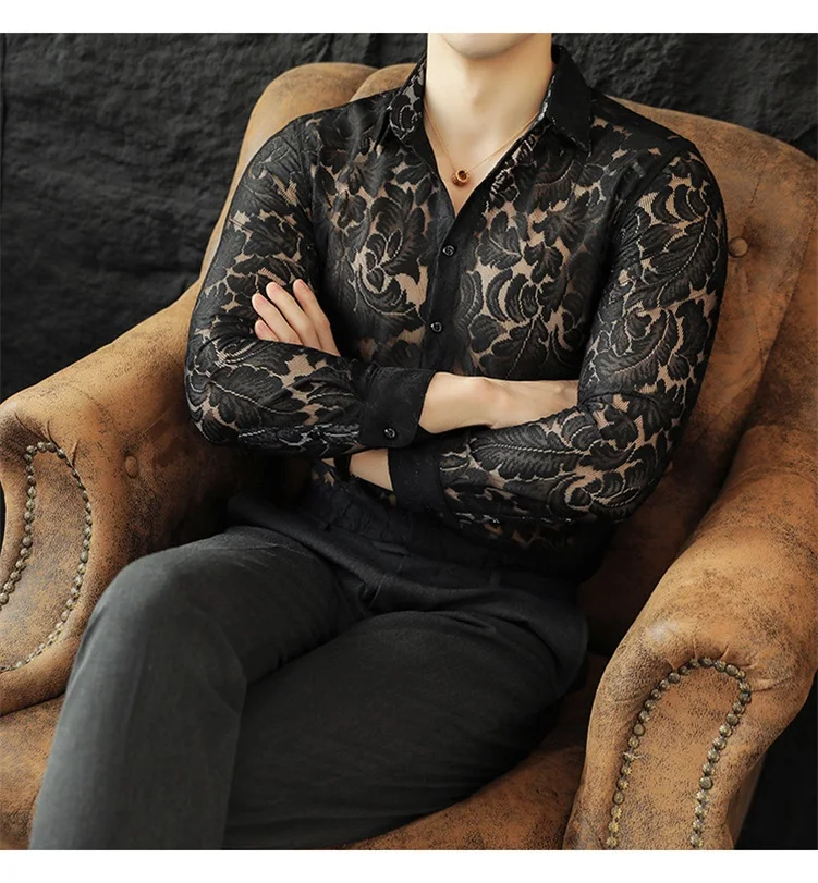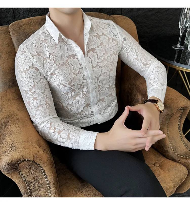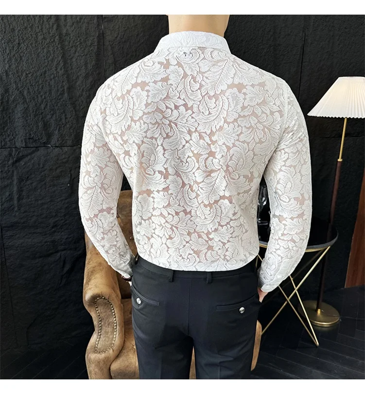 2023 High-quality Sexy Lace Shirt for Men Long Sleeve Slim Fit Casual Shirts Social Party Tuxedo Nightclub Blouse Men Clothing