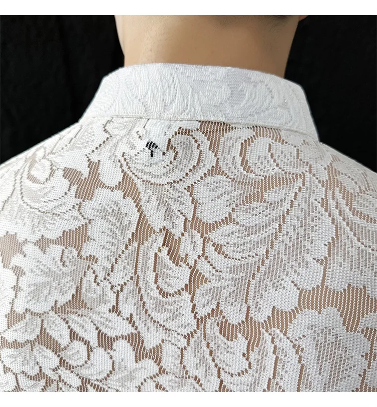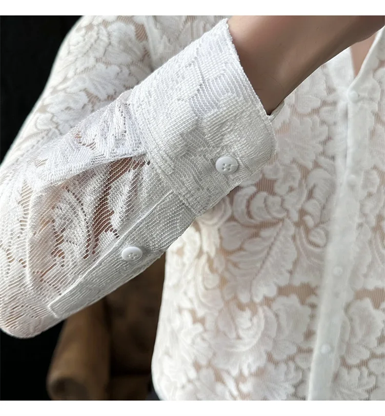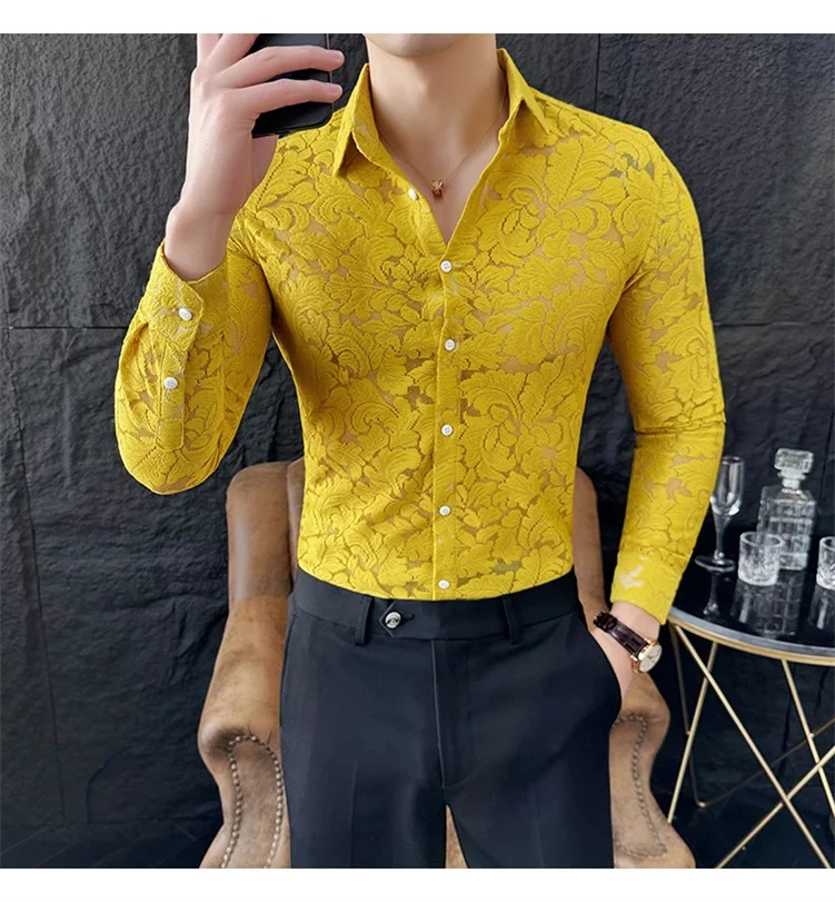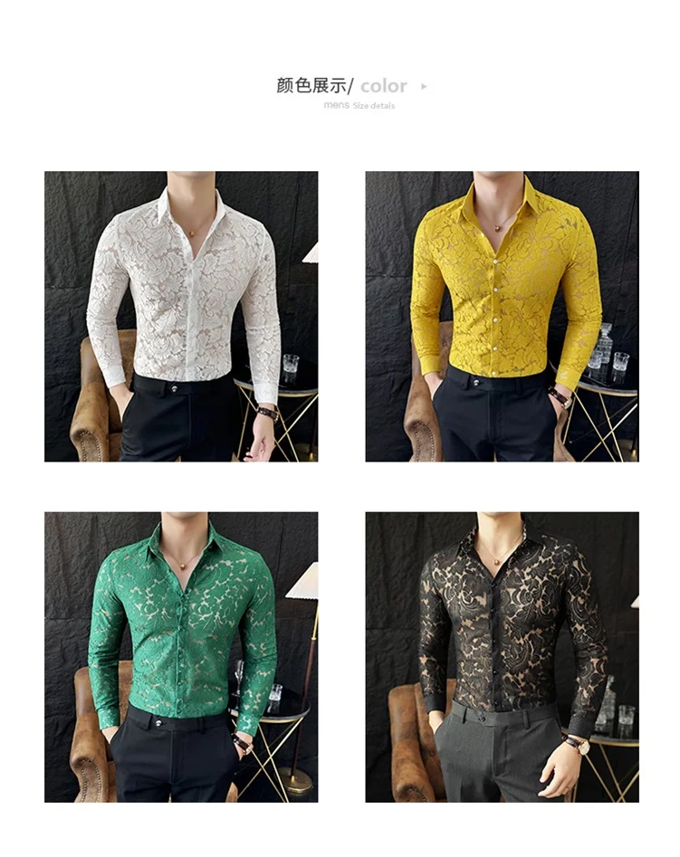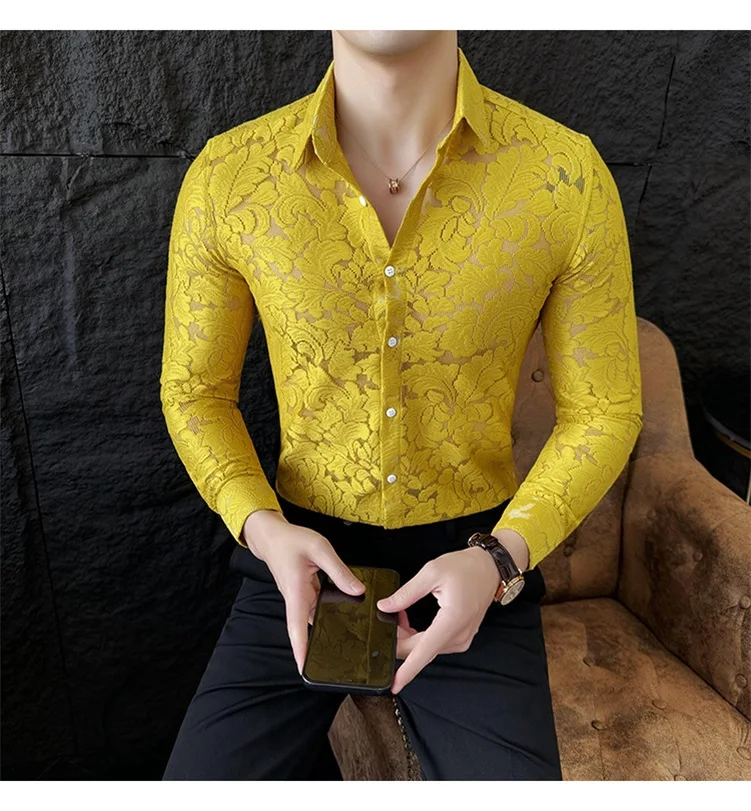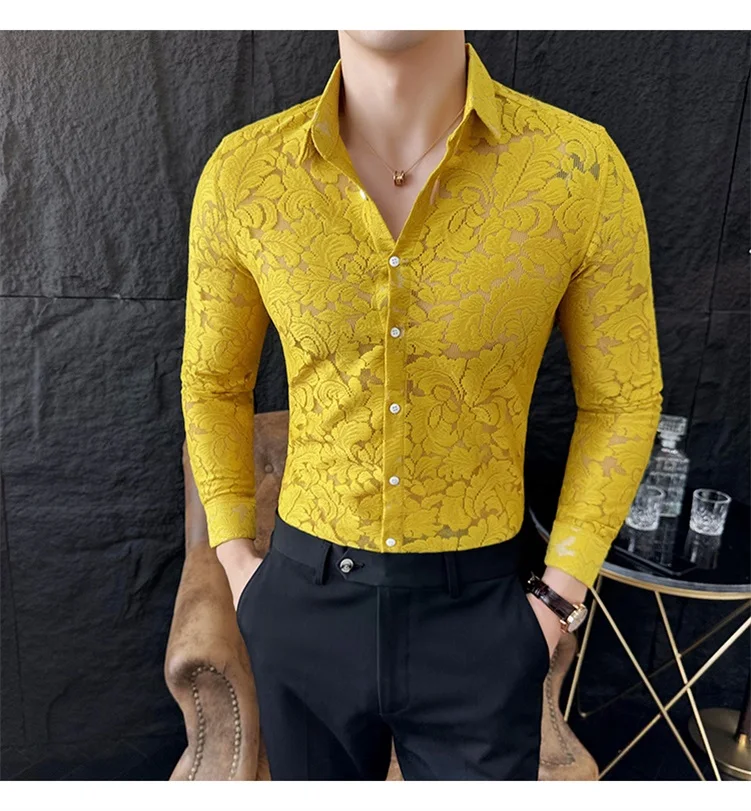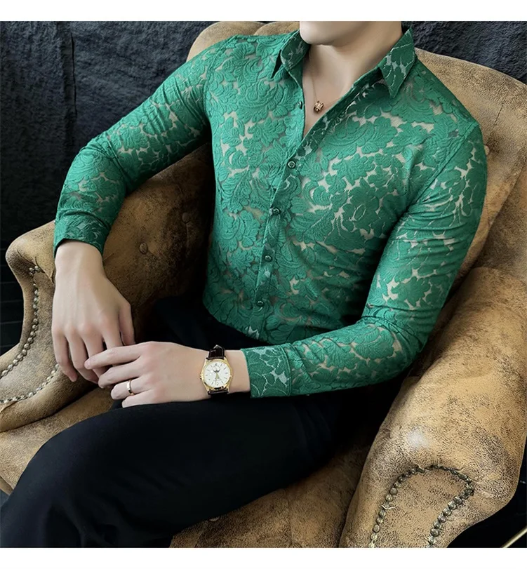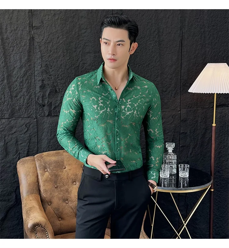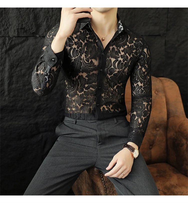 2023 High-quality Sexy Lace Shirt for Men Long Sleeve Slim Fit Casual Shirts Social Party Tuxedo Nightclub Blouse Men Clothing