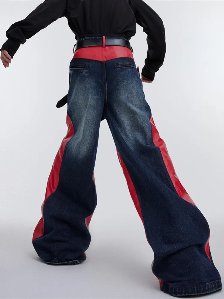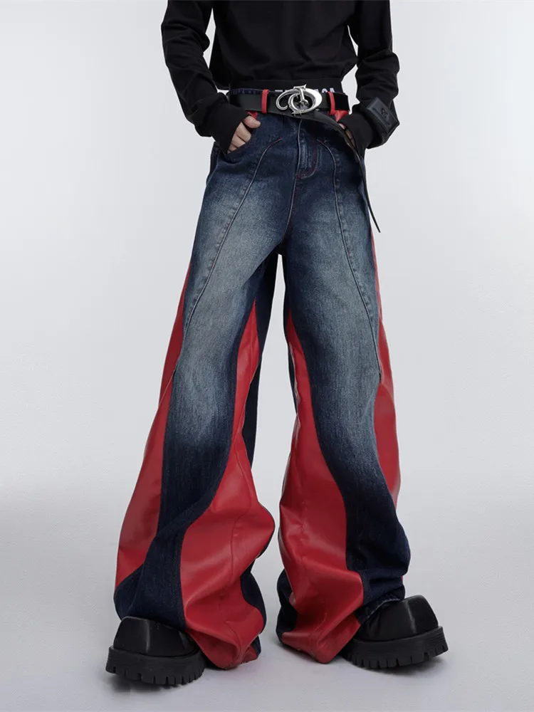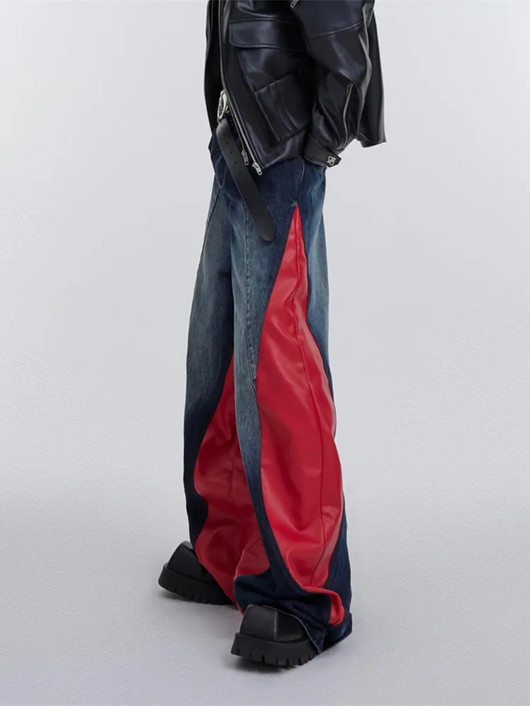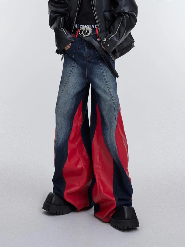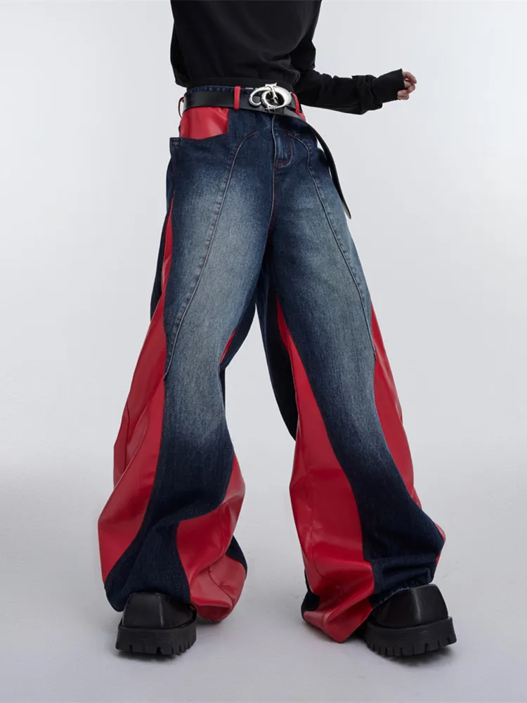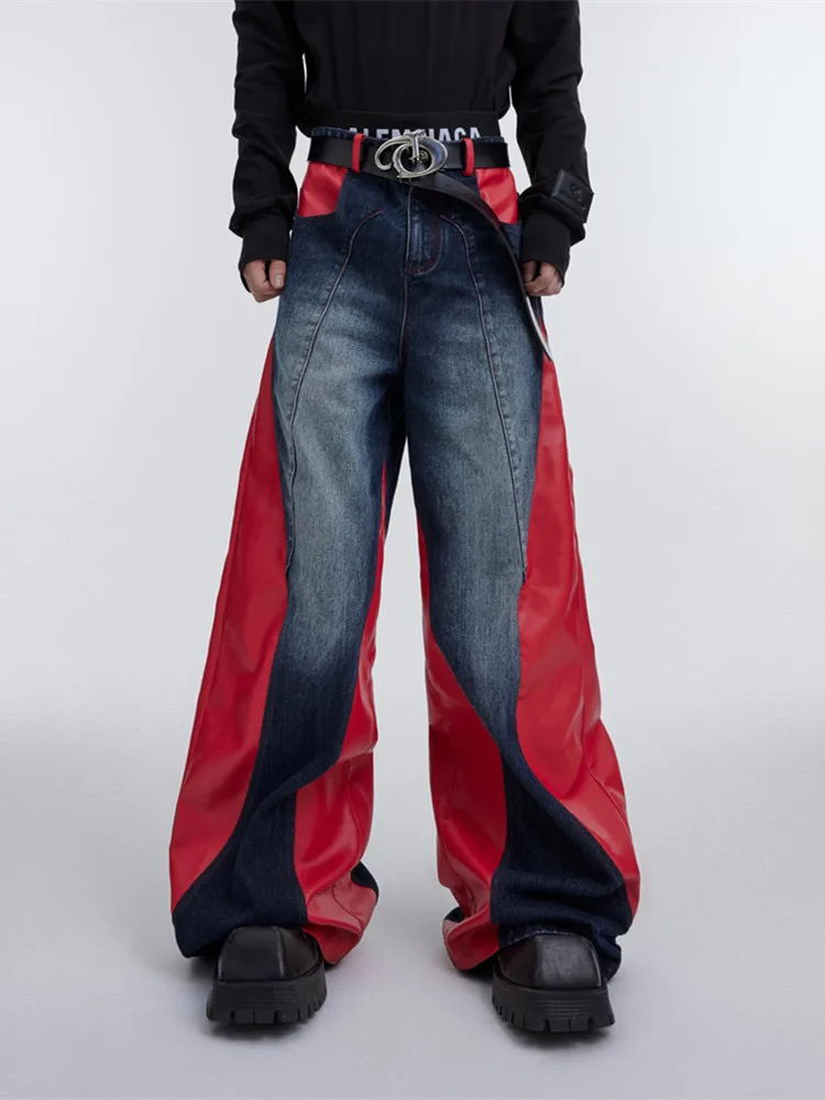 2024 Ropa Y2K Streetwear Red Pu Leather Patchwork Baggy Jeans Pants For Men Designer Clothes Kanye Wide Leg Loose Denim Trousers